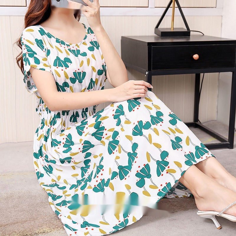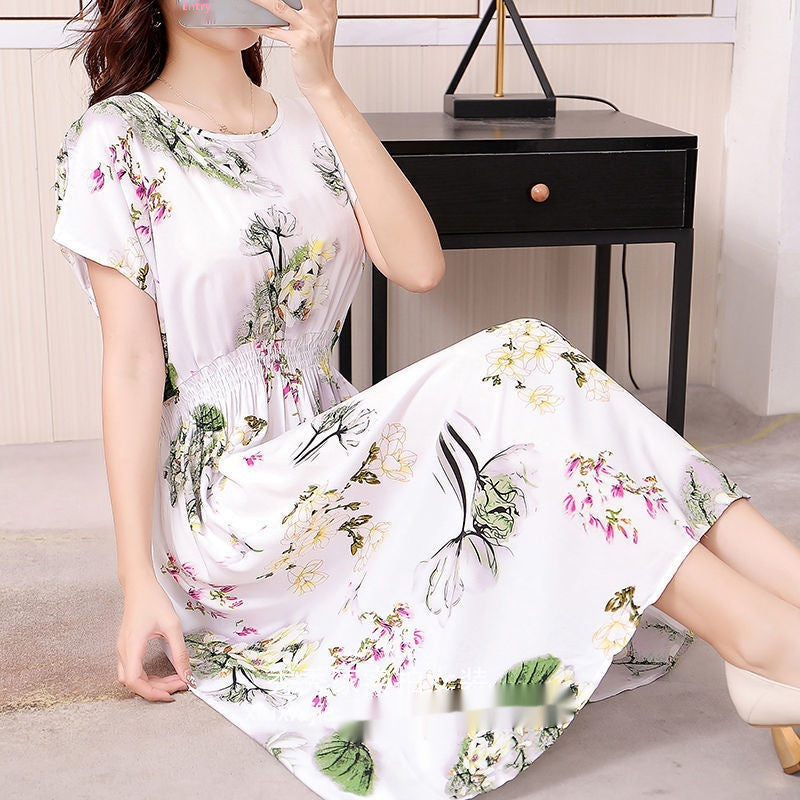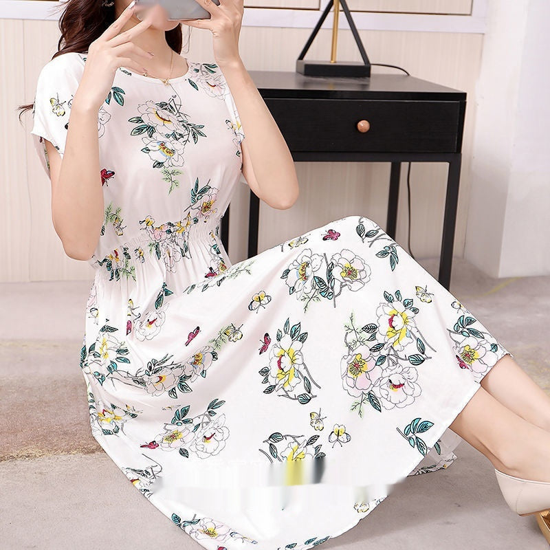 Floral Short Sleeve Dress Elastic And Waisted Slimming