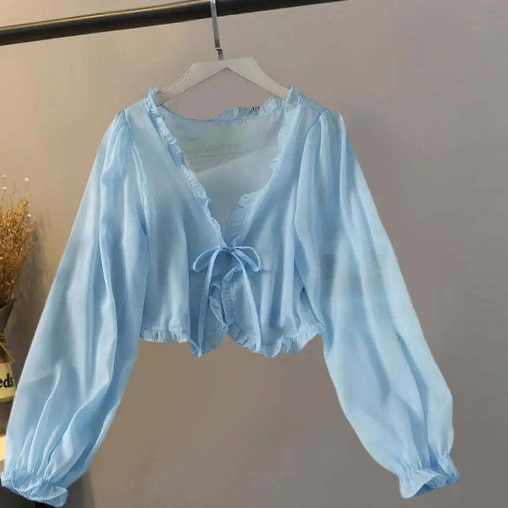 Soft, sheer, and sweetly romantic — the Whimsy Ruffle Blouse is the perfect lightweight layer for dreamy days and flirty nights. Featuring a cropped cut, airy chiffon fabric, and ruffle-trimmed neckline with a bow-tie front, this blouse adds a gentle touch of femininity to any outfit. Style it with high-waisted jeans for casual flair or layer over a lace bralette for extra allure. Available in pastel pink, powder blue, and soft white.